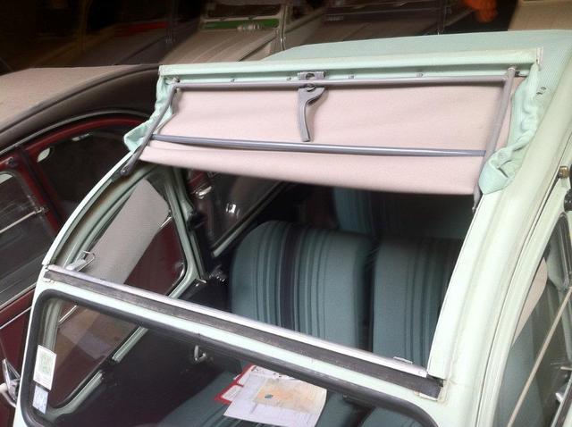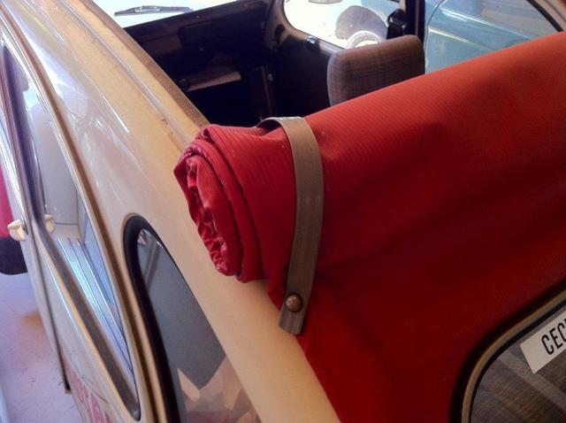 Sur les 2cv à fermeture extérieure, tirer la boucle de la sangle de la capote pour dégager le crochet de fermeture.
