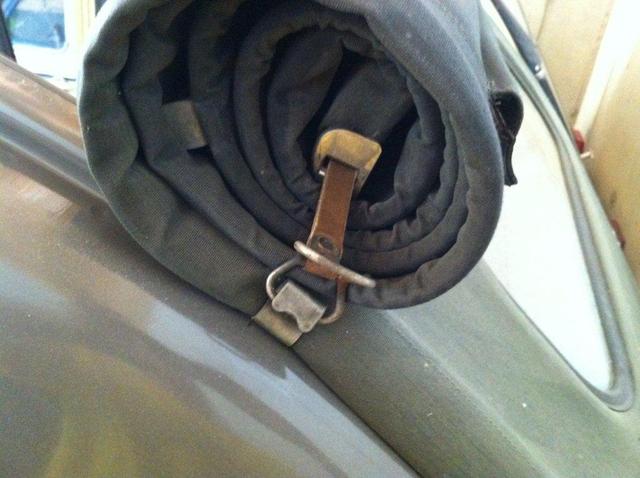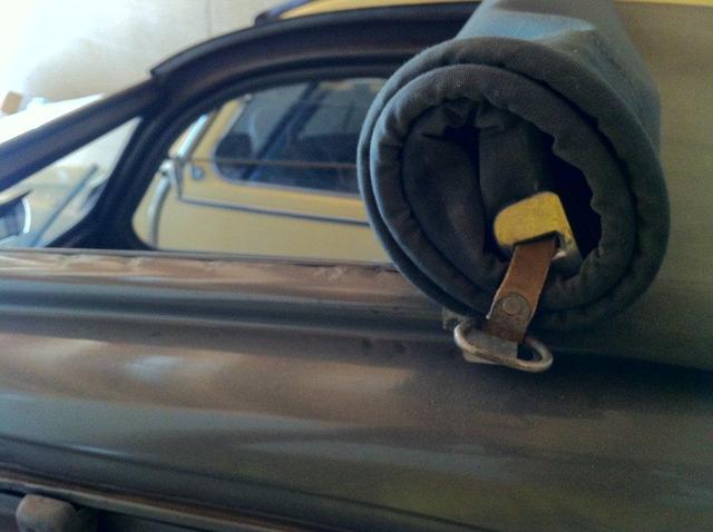 . Rouler la capote vers l'arrière et pour la maintenir ouverte, engager la boucle dans l'ergot prévu sur le haut de la caisse. Sur les modèles anciens, cet ergot fait partie intégrante de la capote.