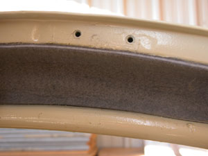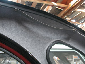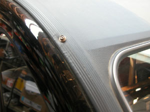 4 / Percer des trous avec le foret de 2.5 dans la gorge en bordure de la garniture en moquette grise. Attention l'emplacement est primordial, comme sur la photo, se baser sur la couture pour fixer le premier bouton pression. Puis mettre en place la sangle | 5 / Mettre en place la capote, vous pouvez rouler ainsi mais attention à rouler à vitesse réduite( 50kmh maxi ), au-delà la capote risque de s'ouvrir et de s'arracher |
