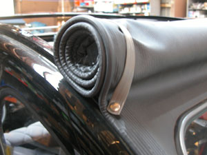 6 / Après avoir percé au préalable la carrosserie (si ce n'est pas déja fait) au niveau de la traverse supérieure, mettre en place le bouton pression de maintien de la capote | 7 / Capote roulée, la sangle qui reste fixée à l'intérieur (d'où l'intérêt de la mettre au bon endroit) sert à maintenir la capote. |