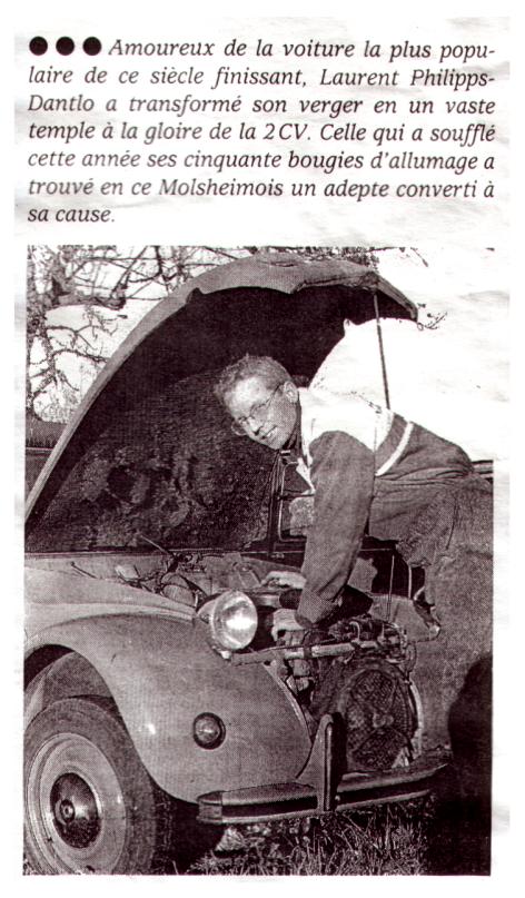 "Arrivée après-guerre, en pleine période de démocratisation de l'automobile, la 2CV a connu un réel succès populaire en conquérant toutes les couches sociales. Sa fabrication ayant pris fin au Portugal le 27 juillet 1990, collectionneurs et amoureux de l'engin aux ailettes bilatérales se battent aujourd'hui pour qu'il demeure un témoin vivant de l'histoire du "quatre roues à moteur". La 2CV est faite pour rouler et non pas pour entrer dans un musée, c'est du moins ce que pense le Molsheimois Laurent Philipps-Dantlo".